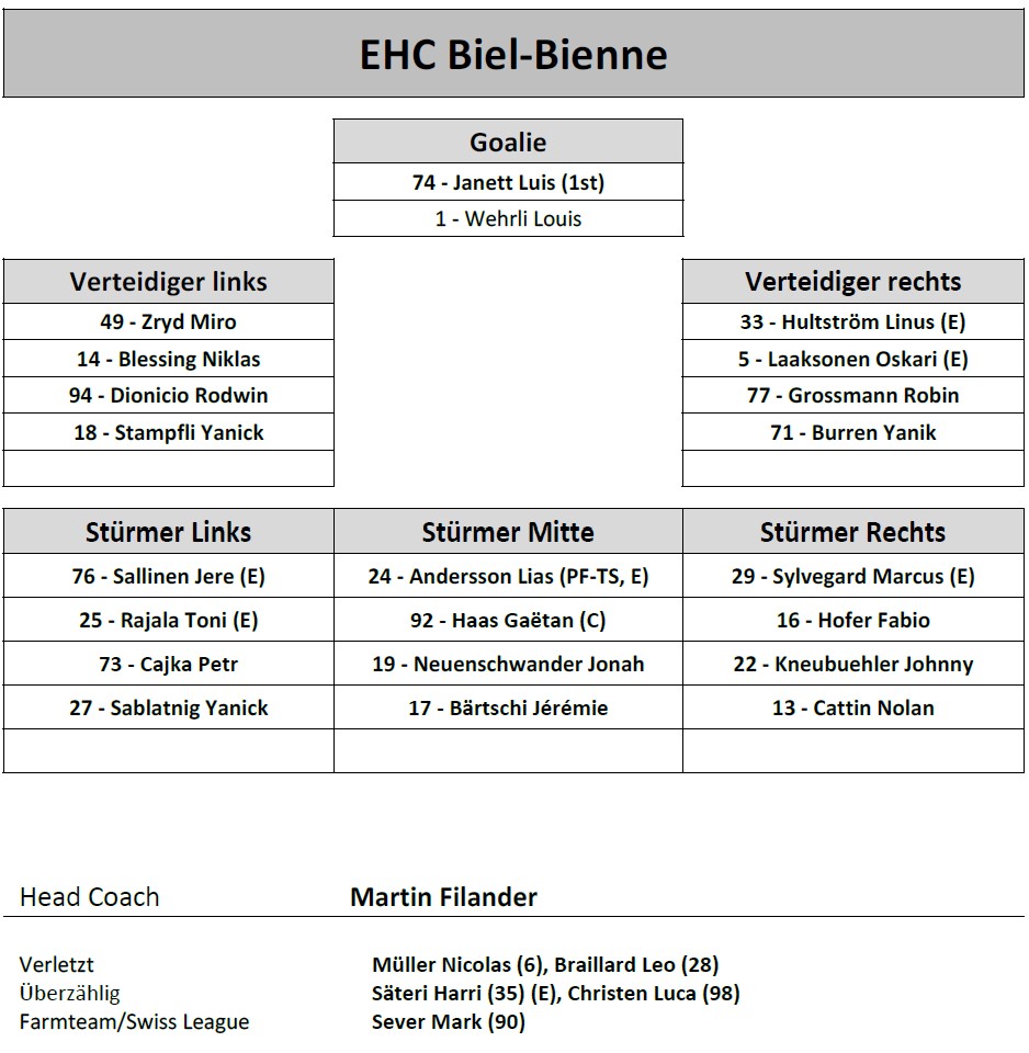 Aufstellung EHC Biel-Bienne