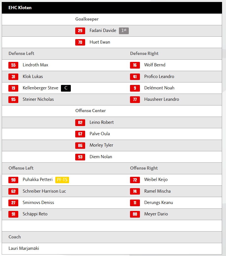 Jesse Puljujärvi beim Servette HC sammelte 17 Punkte für seine Farben und spielt heute als Topscorer für die Gäste. Auf der Gegenseite trägt Petteri Puhakka den Flammenhelm für die Klotener. Der Finne im Dienste der Flieger verbuchte 14 Punkte auf sein Konto.