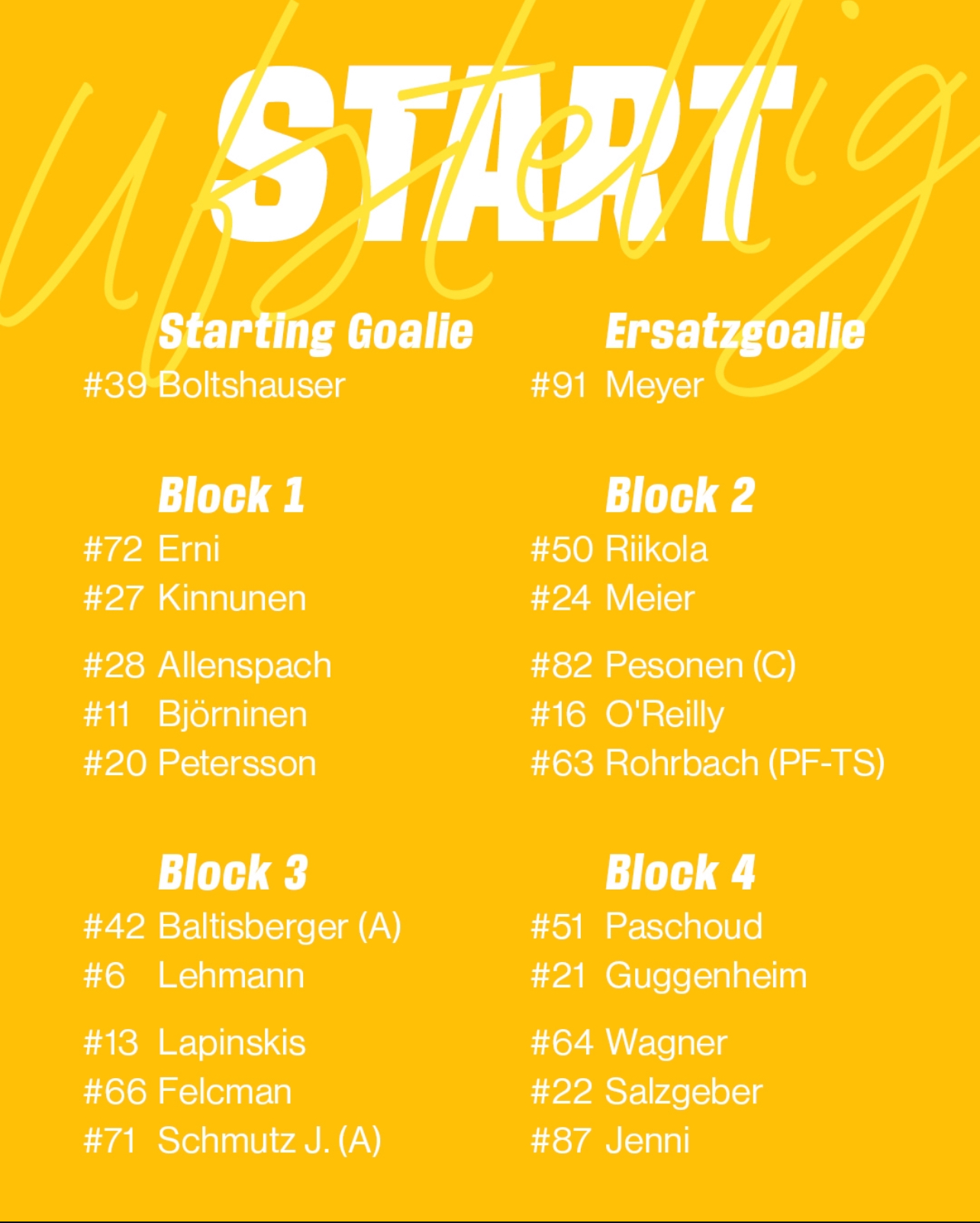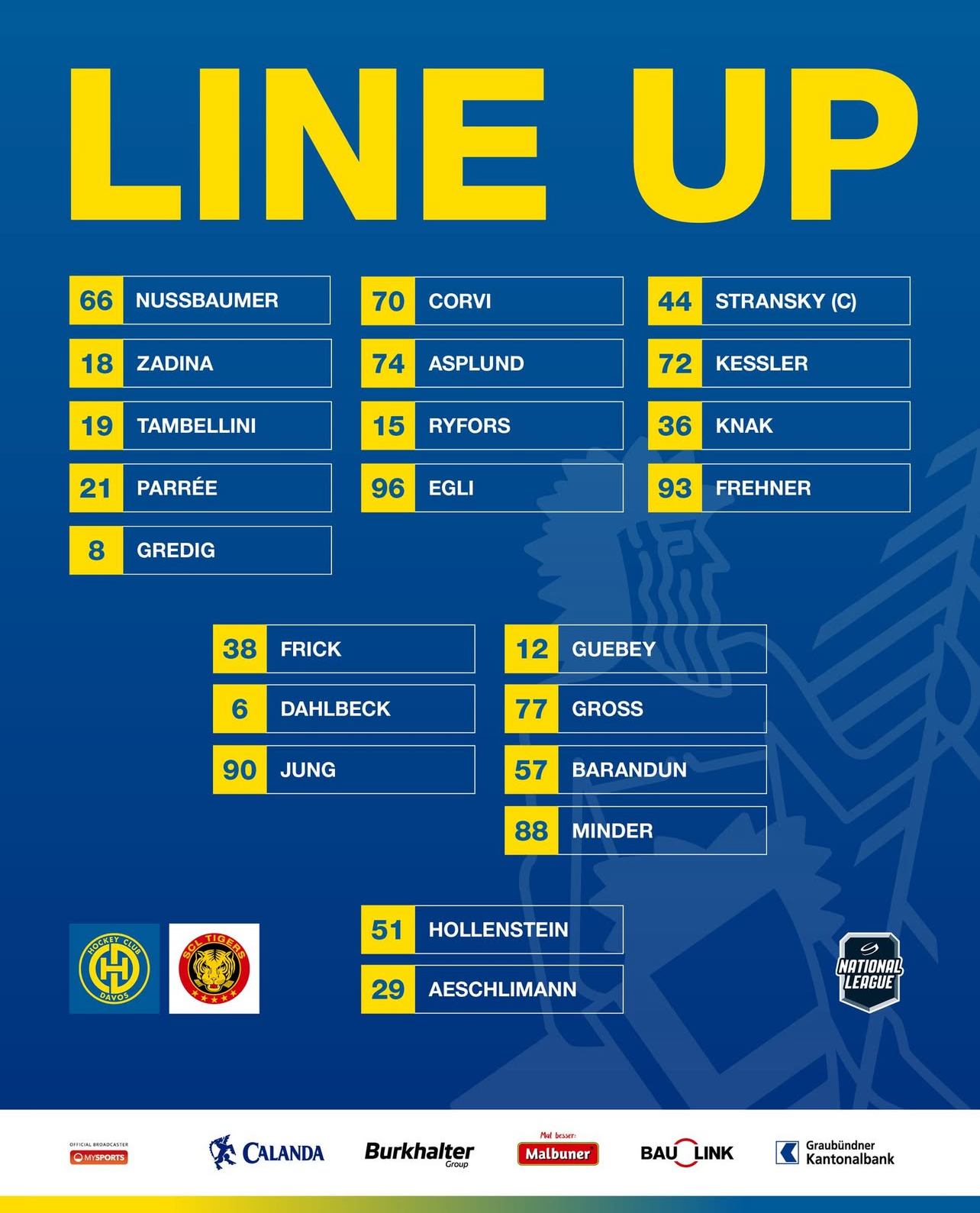 Thierry Paterlini ist auch aufgrund der neuen Verletzen Saku Mäenalanen und Jérôme Bachofer zu Änderungen gezwungen. Zu den beiden gesellen sich Josha Fahrni, Tim Mathys, Flavio Schmutz und Patrick Petrini. Cal O'Reilly und Matteo Wagner sind zurück im Lineup. Claude-Curdin Paschoud gibt heute sein Comeback nach langer Pause. Im Sturm gibt es in jeder Linie je eine Veränderung. Luca Bolthauser statt Robin Meyer hütet heute das Tor.
