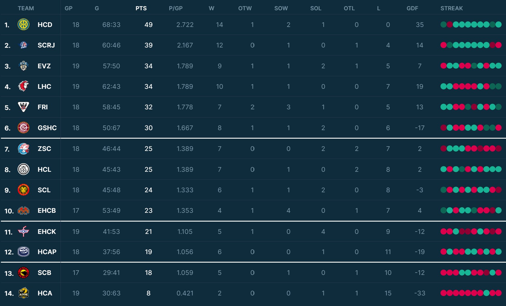 Die Davoser haben nach wie vor in jedem Spiel gepunktet und ein 10-Punkte-Polster auf das zweitplatzierte Rapperswil. Der Gegner heute sind die SCL Tigers. Diese befinden sich auf Rang 9 und somit in einer Gruppe, die punktemässig sehr eng aufeinander sitzt.