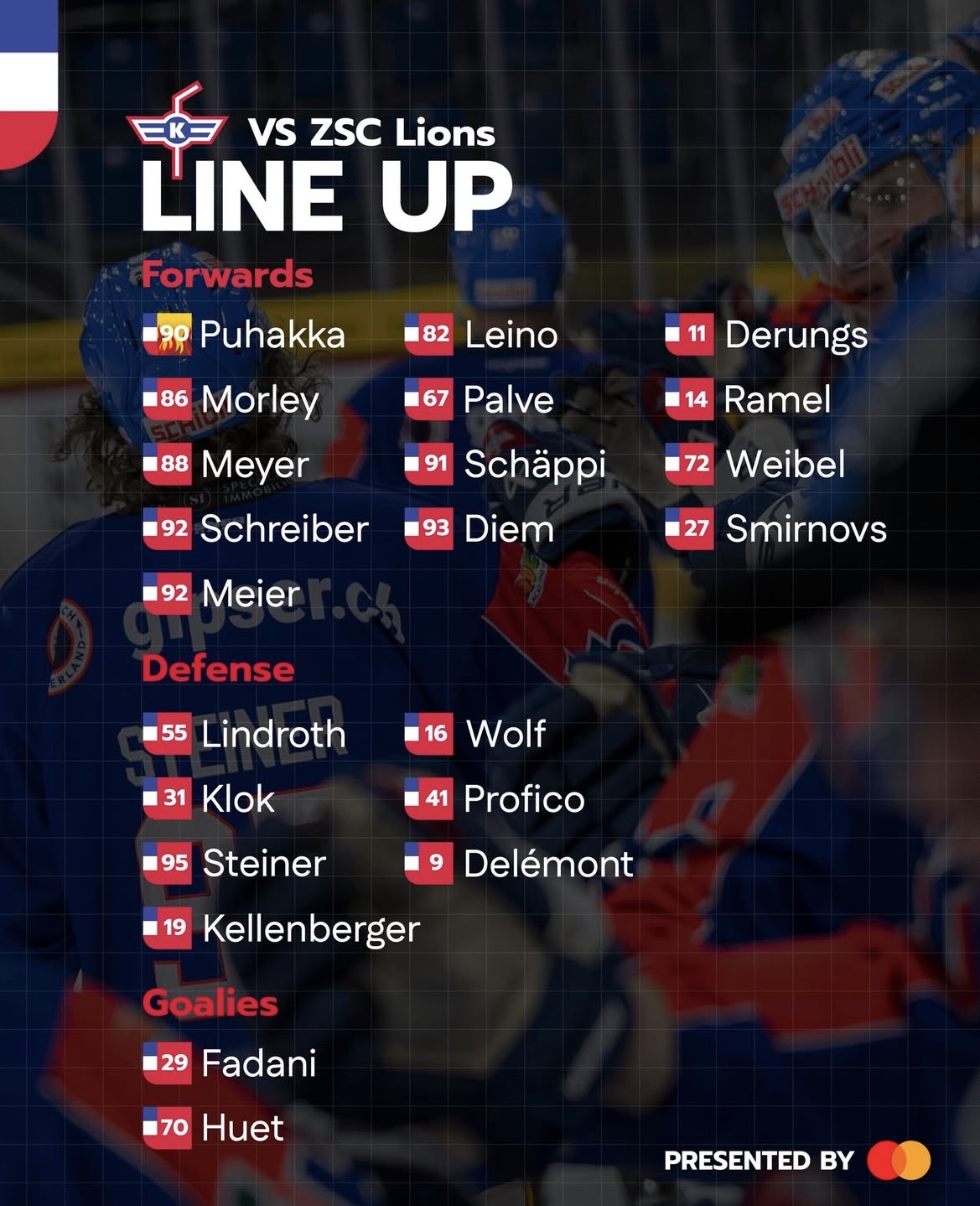 Bei den Lions fehlen Derek Grant und Rudolfs Balcers verletzt. Im Vergleich zur Niederlage gestern gegen Fribourg-Gottéron gibt es einige Änderungen sowohl in der Offensive als auch in der Defensive. So bilden unter anderem Andrighetto und Malgin neu zusammen mit Frödén die erste Linie, während Hollenstein in die dritte Linie mit Andreoff und Åberg rückt. Als 13. Stürmer steht Daniel Olsson im Aufgebot. Im Tor beginnt erneut Simon Hrubec, der mit einer Fangquote von 91,32% bisher unter seinen Vorjahreswerten geblieben ist.