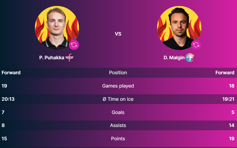 Bei den Lions trägt Denis Malgin den gelben Helm. Der Schweizer Nationalspieler hat in 18 Spielen 19 Punkte gesammelt, darunter 14 Assists und 5 Tore. Bei Kloten ist Petteri Puhakka der Topscorer. Der Finne hat in bislang 19 Einsätzen 15 Punkte erzielt, mit 7 Toren und 8 Assists.