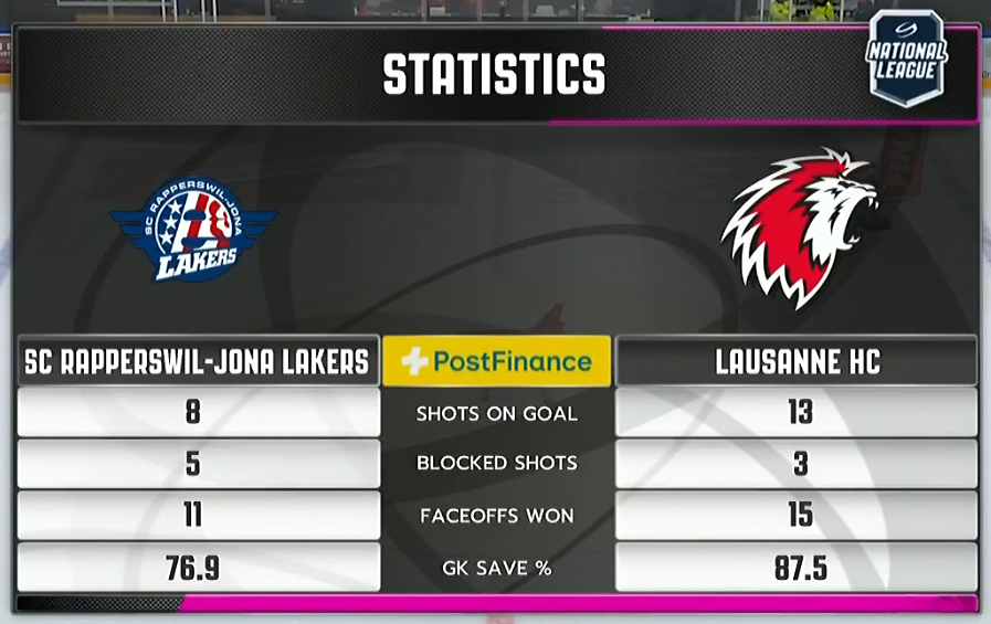 In der neutralen Zone setzen die Hausherren Lausanne zu wenig unter Druck. Das hochkarätige Personal auf Seiten der Gäste weiss dies zu nutzen und dringt bereits wieder in das Angriffsdrittel ein, die Lakers können aber klären.