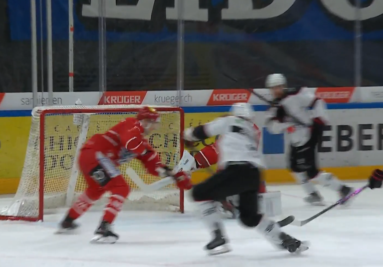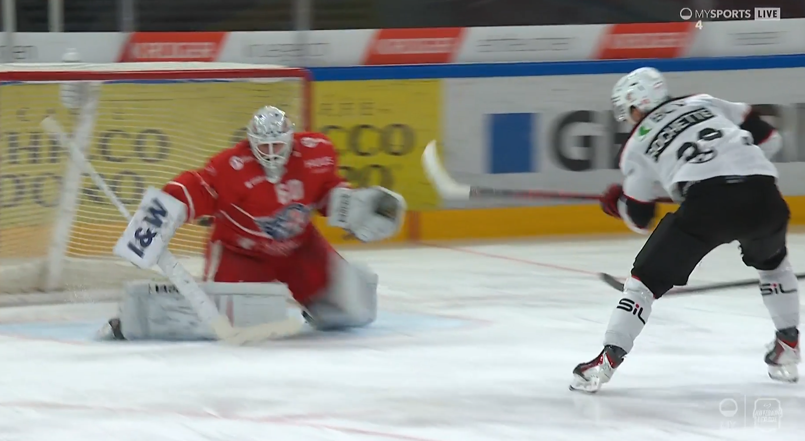 Beinahe der Shorthander! Wetter profitiert von einem schlechten Aufbauspiel von Brännström. Der Rappi-Spieler fängt die Scheibe ab und steht alleine vor Pasche, welcher den Fehler seines Verteidigers korrigiert. Glück für den LHC.
