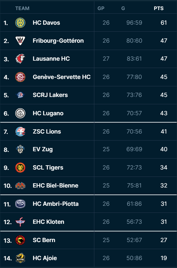 Es ist das Duell David gegen Goliath heute Abend. Der klare Leader HC Davos trifft auf den abgeschlagenen Letzten HC Ajoie. Die Jurassier haben mehr als dreimal weniger Punkte als der HCD auf dem Konto. Ajoie hat nach 26 Partien 19 Punkte gesammelt und liegt damit auf Rang 14. Auf den zweitletzten SCB fehlen bereits acht Punkte, auf die Pre Playoff Plätze sogar 13. Ein Sieg heute ist also fast Pflicht, wenn die Jurassier irgendwie an den Bernern dranbleiben wollen. Ganz anders sieht es beim HCD aus. Die Bündner haben in 26 Partien 61 Punkte gesammelt und liegen 14 Punkte vor dem zweitplatzierten Fribourg Gottéron. Mit einem Sieg könnten sie diesen Vorsprung je nach den anderen Resultaten auf bis zu 16 Punkte ausbauen.