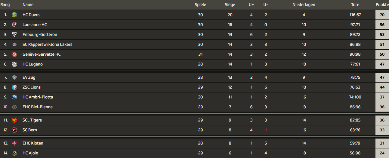 Der Rekordmeister bleibt das Mass aller Dinge und führt mit 70 Punkten aus 30 Spielen die Liga souverän an. Auch zuletzt zeigte Davos seine Klasse: Vier Siege aus fünf Partien, einzig in Genf musste man sich nach Verlängerung mit 3:2 geschlagen geben. Die Holden-Truppe punktete also in allen fünf Spielen. Mit 116 Treffern stellt Davos zudem die klar beste Offensive der Liga.