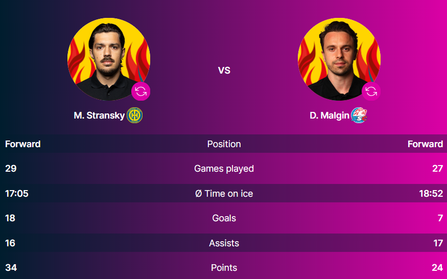 Bei den Hausherren trägt Matej Stransky mit 34 Punkten aus 29 Spielen den Flammenhelm. Beim Zett ist Denis Malgin mit 24 Punkten aus deren 27 Spielen der fleissigste Punktesammler. Malgin fehlt heute Abend aber verletzt, daher trägt Aberg das Shirt des Topscorers.