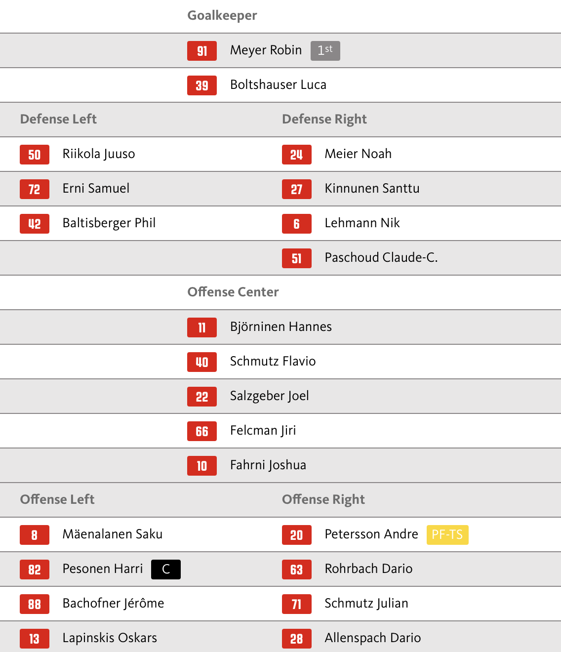 Thierry Paterlini hat einzig im Tor eine Veränderung vorgenommen. Statt Luca Boltshauser spielt Robin Meyer. Ansonsten ist die Aufstellung identisch wie die gegen Lausanne im letzten Spiel. Überzählig sind Tim Matthys und Patrick Petrini.