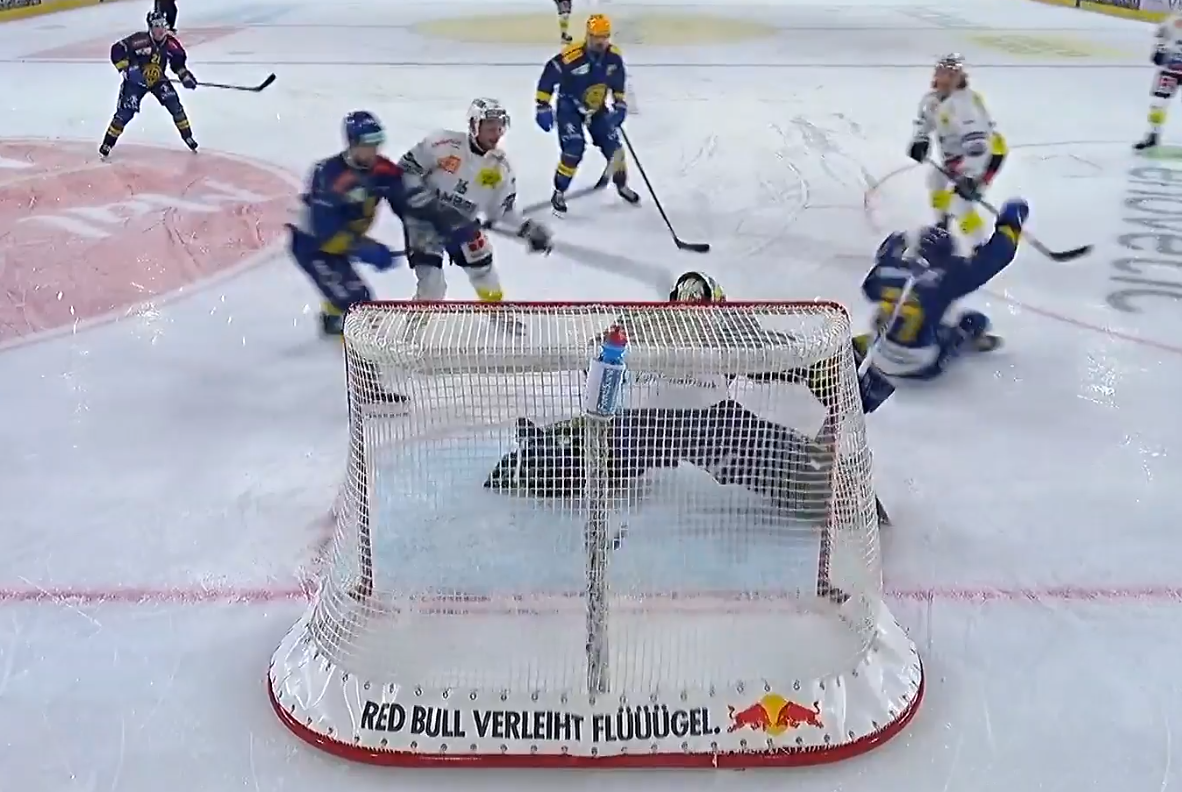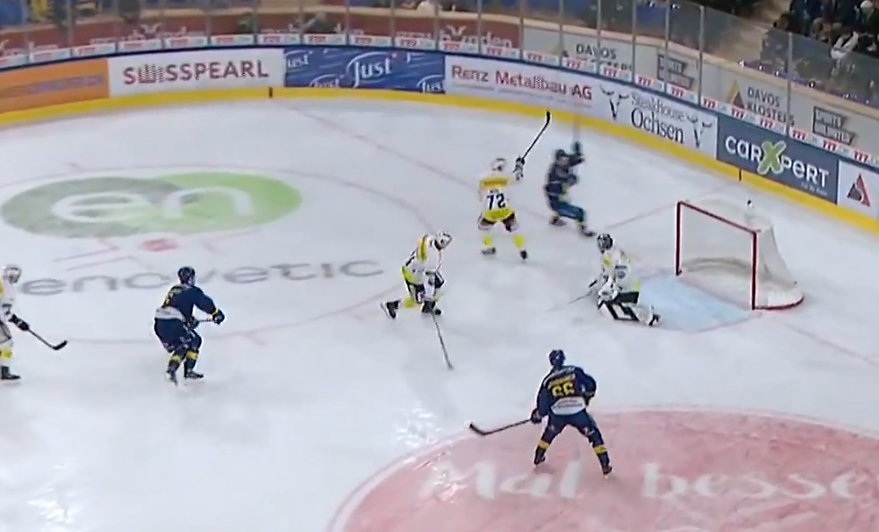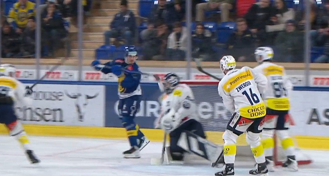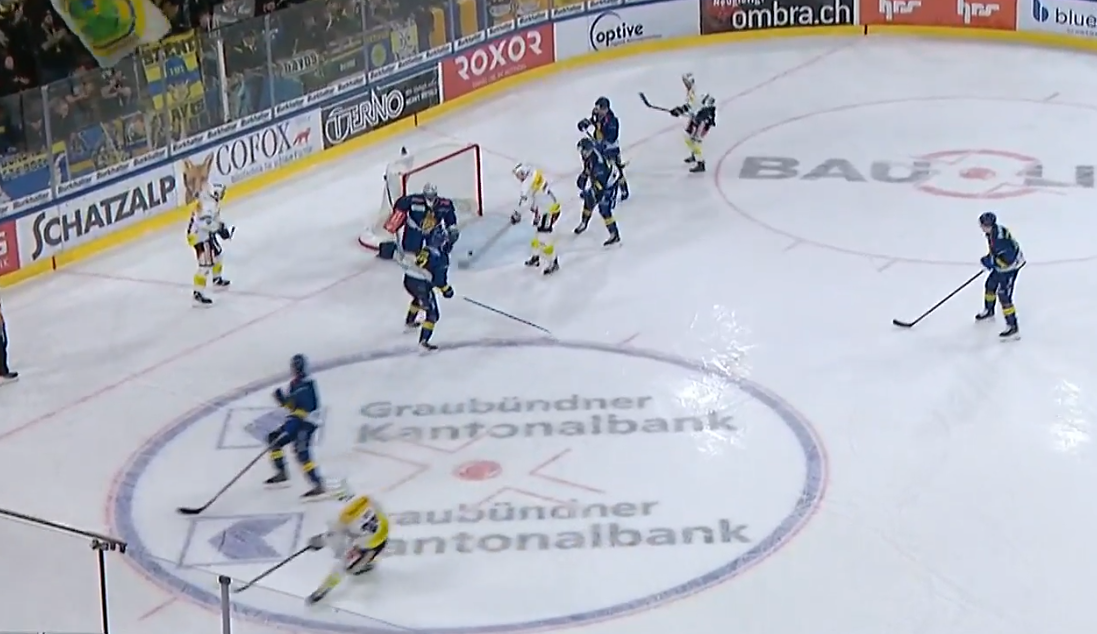 Zadina kommt unverhofft an die Scheibe. Das Hartgummi prallt hinter dem Tor an die Bande und landet überraschend auf der Kelle des HCD-Imports. Dieser will sofort abziehen, Wüthrich verschiebt aber umgehend und verhindert so den Führungstreffer der Hausherren.