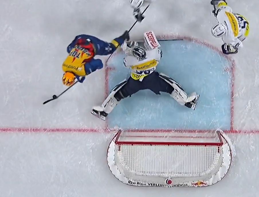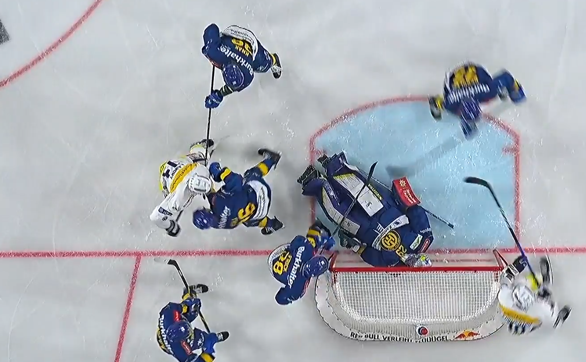 Ambri mit der nächsten guten Möglichkeit. Aeschlimann wehrt mehrfach ab, verliert dann aber den Überblick. Er weiss nicht, wo die Scheibe ist und legt sich einfach flach hin. Dabei blockiert er die Scheibe und sorgt so für ein Bully in der eigenen Zone.