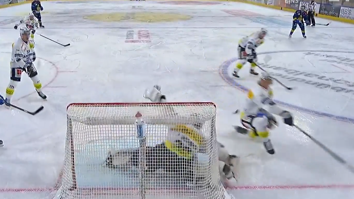 Was ist denn hier los? Plötzlich fallen die Tore wie der Schnee. DiDomenico zieht an der blauen Linie drei Gegenspieler auf sich. Mit einem Traumzuspiel auf Zwerger lässt er alle stehen. Dieser bezwingt dann Aeschlimann und setzt die Weichen auf Sieg.