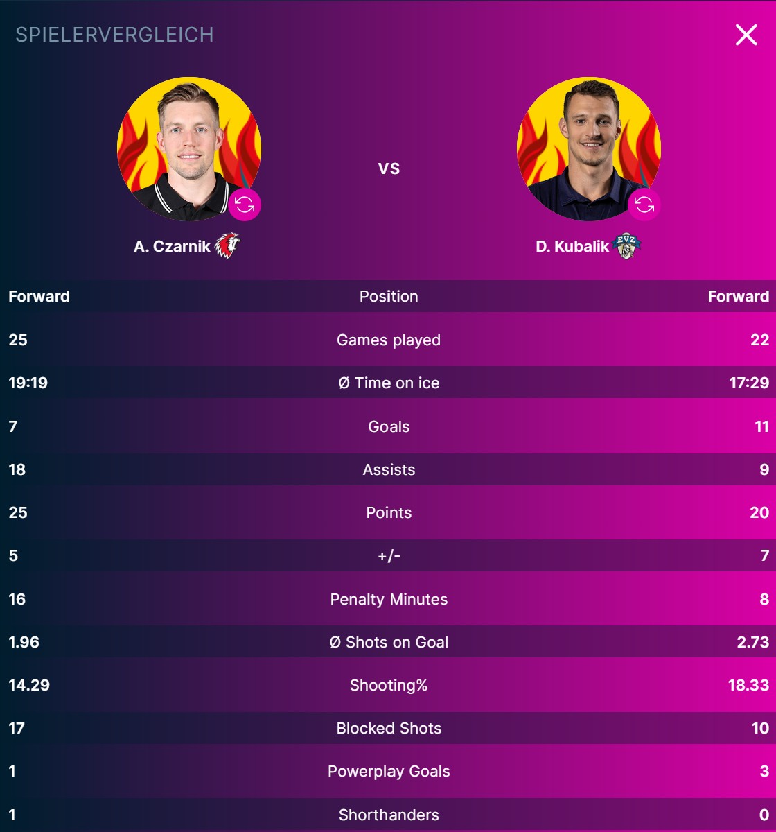 Beim Lausanne HC trägt Austin Czarnik den gelben Helm. Der US-Amerikaner hat bisher sieben Tore erzielt und 18 Assists geliefert. Beim EV Zug ist Dominik Kubalik der beste Punktesammler. Der Tscheche hat elf Tore und neun Assists auf dem Konto.