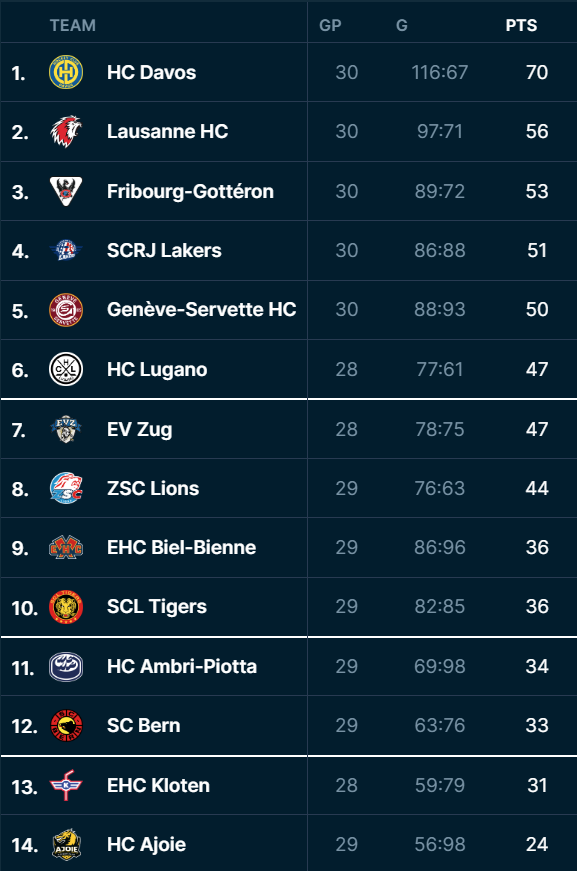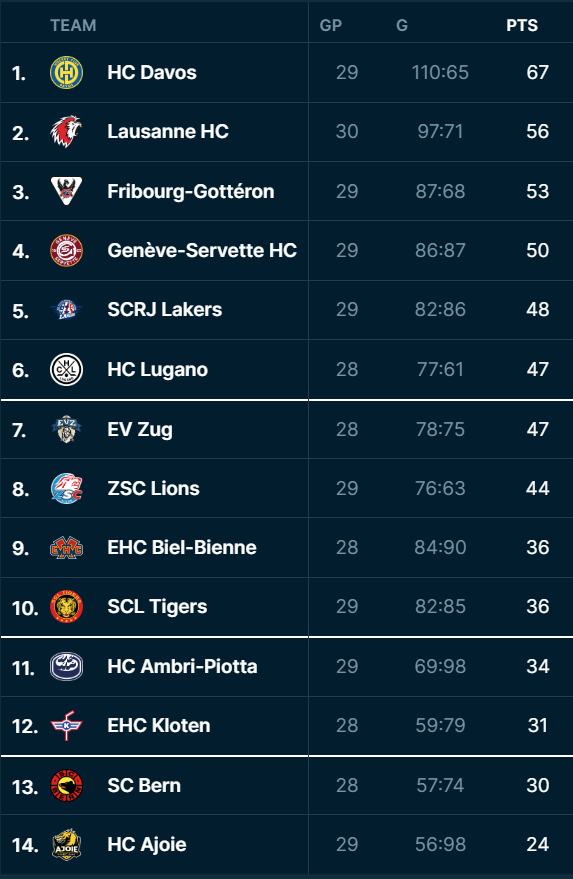 Bern ist mit dem Sieg an Kloten vorbeigezogen und steht neu mit 33 Punkten auf Rang 12. Der Rückstand auf die Play-In Plätze beträgt nur noch drei Punkte, damit ist wieder alles möglich. Biel bleibt mit 36 Punkten auf Rang neun, muss sich nun aber definitiv nach hinten orientieren, denn der Vorsprung auf die Verfolger schmilzt dahin.