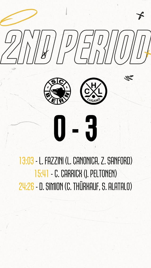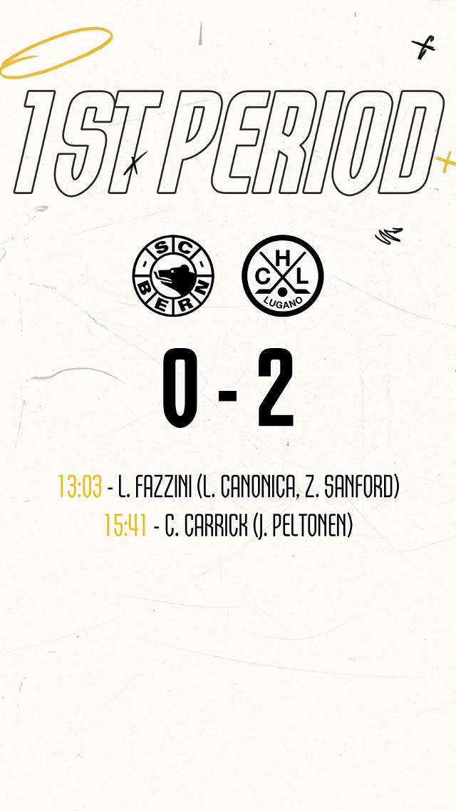 Lugano führt 2:0, vor allem dank eiskalter Effizienz. Obwohl die Abschlüsse mit 6:6 ausgeglichen sind und Bern beim xG-Wert sogar leicht vorne liegt, schlagen die Tessiner aus wenig Chancen viel Profit: Erst bringt ein abgefälschter Schuss von Fazzini die 1:0-Führung, kurz darauf rutscht Carricks scharfes Zuspiel durch den dichten Verkehr vor Reideborn ins Netz. Bern startet druckvoll, trifft durch Untersander nur den Pfosten und scheitert in der besten Szene an Van Pottelberghe. Danach verteidigt Lugano kompakt, lauert clever und nimmt dem SCB nach dem Doppelschlag sichtbar den Wind aus den Segeln.
