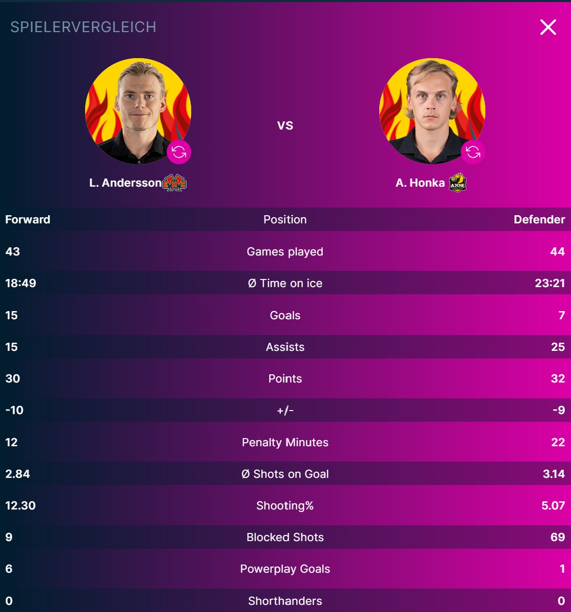 Beim EHC Biel-Bienne trägt Lias Andersson den gelben Helm. Der Schwede hat bisher 15 Tore erzielt und 15 Assists geliefert. Beim HC Ajoie ist Anttoni Honka der beste Punktesammler. Der Finne hat sieben Tore und 25 Assists auf dem Konto.