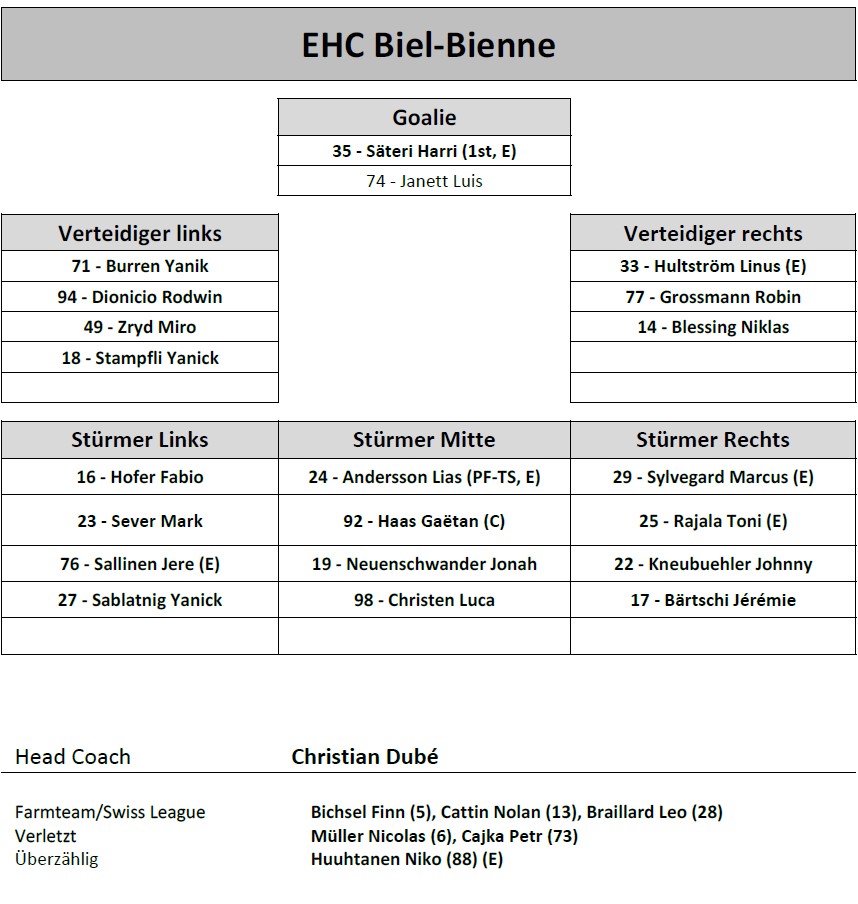 Aufstellung EHC Biel-Bienne