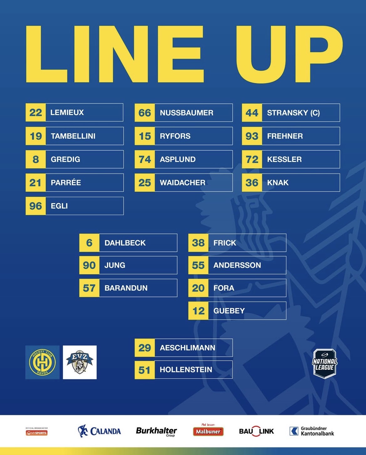 Beim HCD fehlen Filip Zadina und Tim Minder überzählig, Enzo Corvi ist verletzt und der Ex-Zuger Nico Gross fehlt krankheitsbedingt. Im Vergleich zum Spiel gegen Lugano werden die Linien etwas durchrotiert, Holden scheint im Hinblick auf die Playoffs noch zu tüfteln. Gleich bleibt die erste Linie mit Lemieux, Stránský und Nussbaumer, die Lugano phasenweise schwindlig gespielt hat. Im Tor steht Sandro Aeschlimann, der mit einer Fangquote von 92,16% in dieser Saison bislang überzeugt.