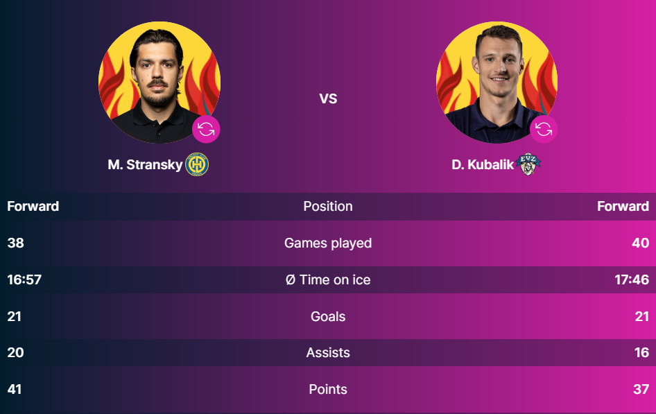 Beim HCD trägt Matěj Stránský den gelben Helm. Er hat in 38 Spielen bislang 21 Tore erzielt, das ist Ligabestwert, dazu kommen 20 Assists. Damit steht er bei 41 Punkten. Beim EVZ ist ebenfalls ein Tscheche Topscorer. Dominik Kubalík kommt in 40 Einsätzen auf 37 Punkte, verteilt auf 21 Tore und 16 Assists.