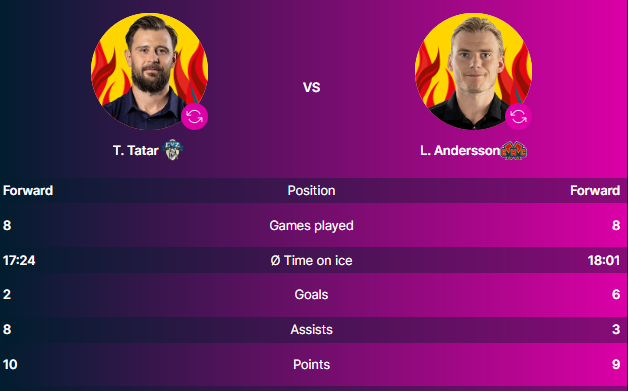 Bei den Gästen trägt Tomas Tatar den gelben Helm. Er hat in acht Partien zehn Punkte gesammelt, darunter zwei Tore und acht Assists. Bei den Bielern ist Lias Andersson der Topscorer, er kommt ebenfalls in acht Einsätzen auf neun Punkte, davon sechs Tore und drei Assists.