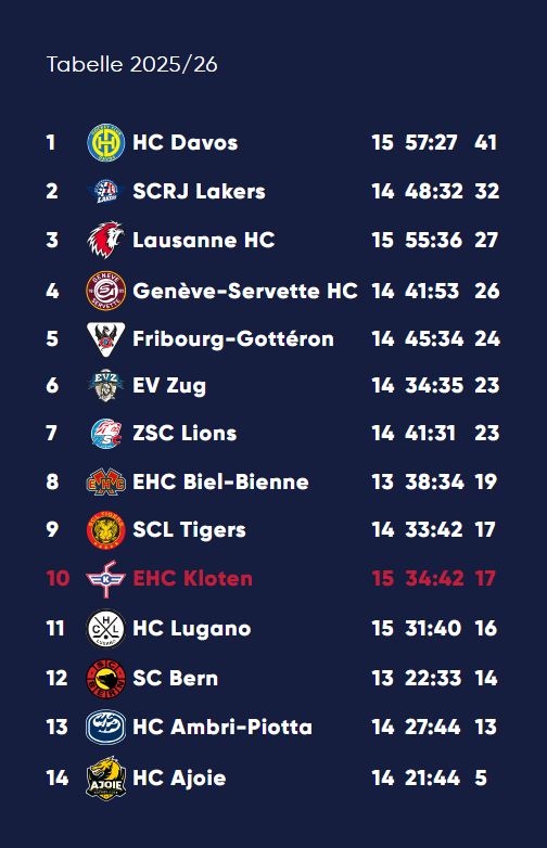 Das Kellerkind Ajoie empfängt den EHC Kloten. Die Klotener haben zuletzt drei Spiele hintereinander verloren. Zwei davon im Penaltyschiessen. Aktuell stehen sie mit 17 Punkten auf Tabellenrang 10. Das Heimteam hat seit acht Partien nicht mehr gewonnen. Die Ajoulots sind mit 5 Punkten weit abgeschlagen auf Tabellenrang 14. Jeder Punkt für das Heimteam ist Gold wert.