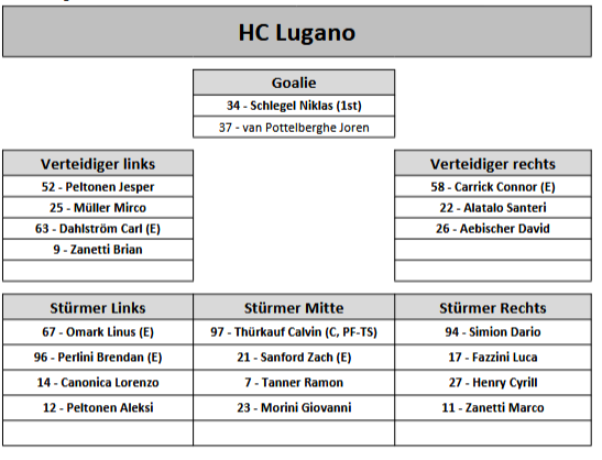 Und so die Gäste aus dem Tessin: Es fehlt der gesperrte Sekac und die verletzten Bertaggia, Kupari und Sgarbossa.