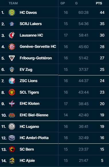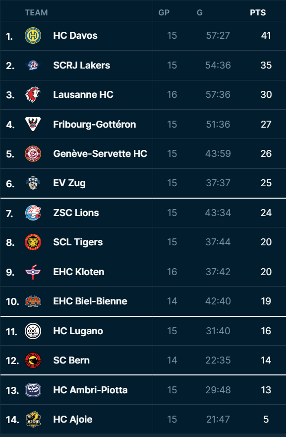 Die Tigers rücken bis auf einen Punkt an Meister ZSC heran und bleiben mit neu 23 Punkten auf Rang 8. Fribourg fällt einen Platz zurück und liegt nun auf Rang 5, nur noch vier Punkte vor den Tigers.
