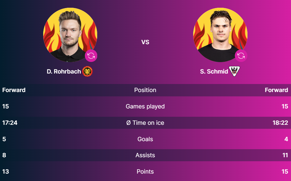 Bei den Tigers trägt Dario Rohrbach das gelbe Trikot, er kommt in dieser Saison bislang auf 13 Punkte, erzielt durch 5 Tore und 8 Assists. Zwei Punkte mehr hat Sandro Schmid, der Topscorer von Fribourg-Gottéron steht bei 4 Toren und 11 Assists.