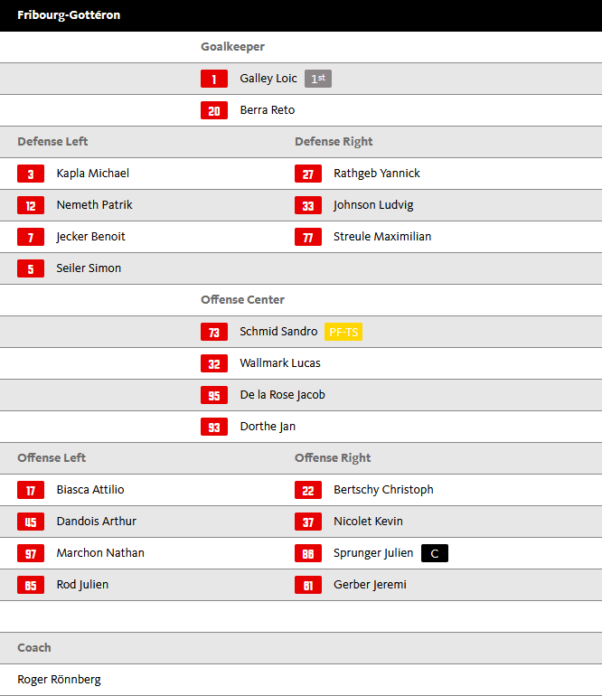 Auch Headcoach Rönnberg vollzieht im Vergleich zur letzten Partie gegen den SCB den Torhüterwechsel: Den Kasten der Saanestädter hütet am heutigen Abend Calley, Berra agiert als Ersatztorhüter. Dandois verstärkt die Offensive, ansonsten bleibt bis auf wenige Linien- und Positionswechsel alles gleich. Da Topscorer Marcus Sörensen aufgrund seiner Verletzung weiterhin ausfällt, wird Schmid als Topscorer auflaufen. Hier die Aufstellung von Gottéron: