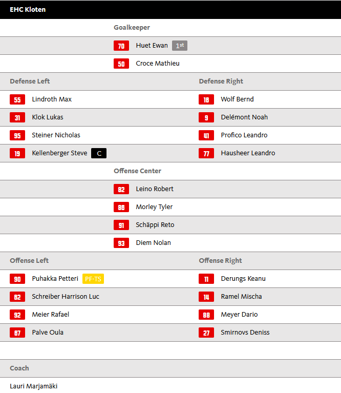 Im Vergleich zur letzten Partie gegen den ZSC vollzieht Headcoach Marjamäki den Torhüterwechsel, anstelle von Fadani (hat sich im vergangenen Spiel gegen den ZSC verletzt) hütet heute Abend Huet den Klotener Kasten. Auch auf der Ersatzhüterposition wird ein Wechsel vollzogen, als Nummer zwei agiert Mathieu Croce. Er wurde via B-Lizenz vom HC Thurgau ins Team geholt, da Fadani zwei bis drei Wochen pausieren muss. Ansonsten bleibt bis auf einige Linien- und Positionswechsel in der Offensive alles gleich. Hier die Aufstellung des Heimteams: