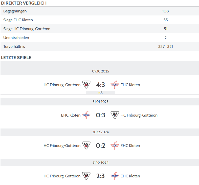 Die beiden Mannschaften trafen bereits 108 Mal aufeinander. Kloten konnte 55 Spiele für sich entscheiden, 51 Partien gingen zugunsten der Saanestädter aus. Zwei Partien endeten mit einem Unentschieden. Das Torverhältnis geht mit 337:321 erzielten Treffern zugunsten von Kloten aus. In der vergangenen Saison konnte Kloten drei der vier Direktduelle für sich entscheiden, das erste Aufeinandertreffen in dieser Saison ging mit 4:3 zugunsten von Fribourg aus.
