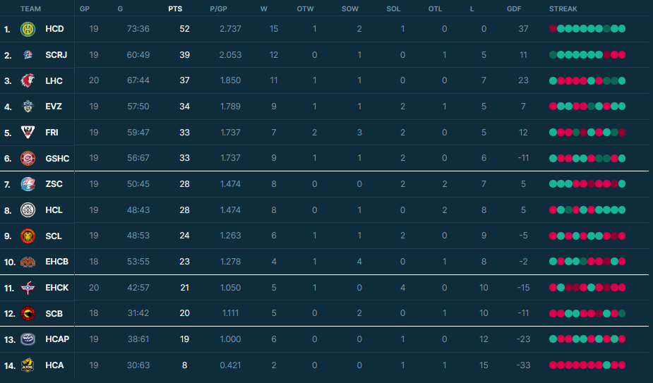 Kloten konnte sich nach 20 bestrittenen Runden nur 21 Punkte sichern und befindet sich auf dem elften Tabellenplatz. Mit nur 42 erzielten Treffern haben die Flughafenstädter hinter Bern, Ambri und Ajoie den schlechtesten Offensivwert der Liga. Fribourg hat mit einem Spiel weniger in den Beinen 33 Punkte aufs Konto verbucht und ist derzeit auf dem fünften Rang. Die Tabellensituation ist in der oberen Hälfte sehr eng, zwischen dem achtplatzierten HC Lugano und dem drittplatzierten Lausanne HC liegen nur neun Punkte.