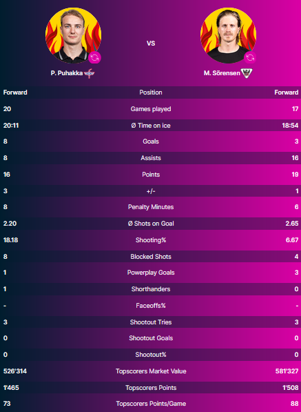 Bei Kloten ist Petteri Puhakka Topscorer, er sicherte sich in 20 Spielen 16 Punkte (8 Tore / 8 Assists). Bei Fribourg trägt Marcus Sörensen den goldenen Helm, er verbuchte in 17 Spielen 19 Punkte (3 Tore / 16 Assists)