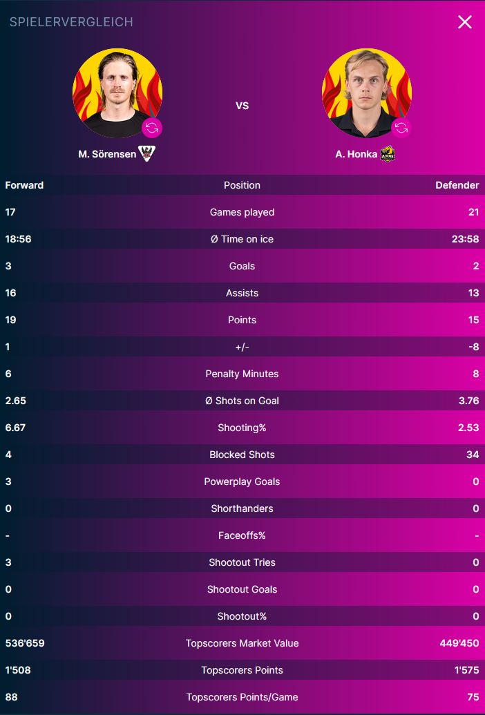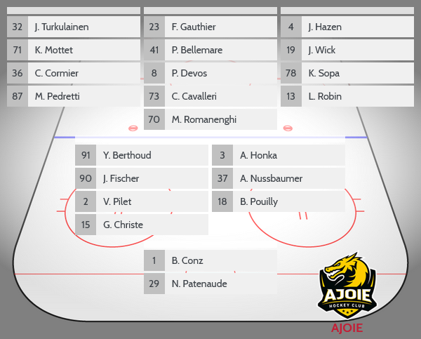 Die Topscorer am heutigen Abend sind auf Seiten des Heimteams Stürmer Marcus Sörensen (19 Punkte davon 3 Tore und 16 Assists). Bei den Gästen aus Ajoie trägt Verteidiger Anttoni Honka (15 Punkte davon 2 Tore und 13 Assists) den Flammenhelm.