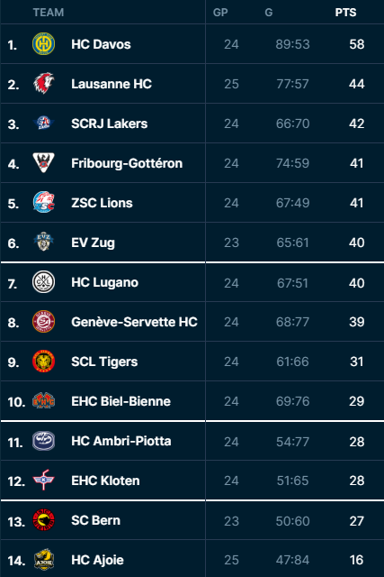 Davos thront weiterhin unangefochten an der Spitze! Ganze 14 (!) Punkte Vorsprung auf den ersten Verfolger Lausanne – und das mit einem Spiel weniger auf dem Konto. Eine Dominanz, die ihresgleichen sucht. Ganz anders die Lage bei Ambri: Rang 11, weniger als die Hälfte der Zähler des HCD und der Atem der direkten Konkurrenten im Nacken. Für die Biancoblu zählt jeder Punkt, um nicht weiter abzurutschen. David gegen Goliath – oder schreibt Ambri das nächste Kapitel seiner Erfolgsstory gegen Davos? Die Antwort gibt’s heute Abend. Spannung pur!
