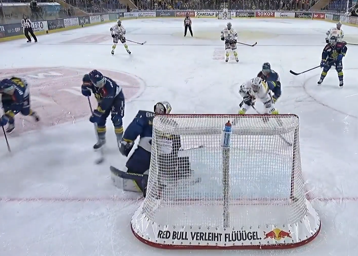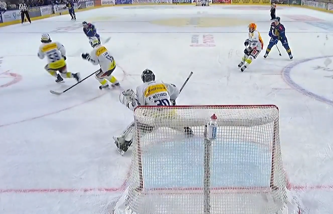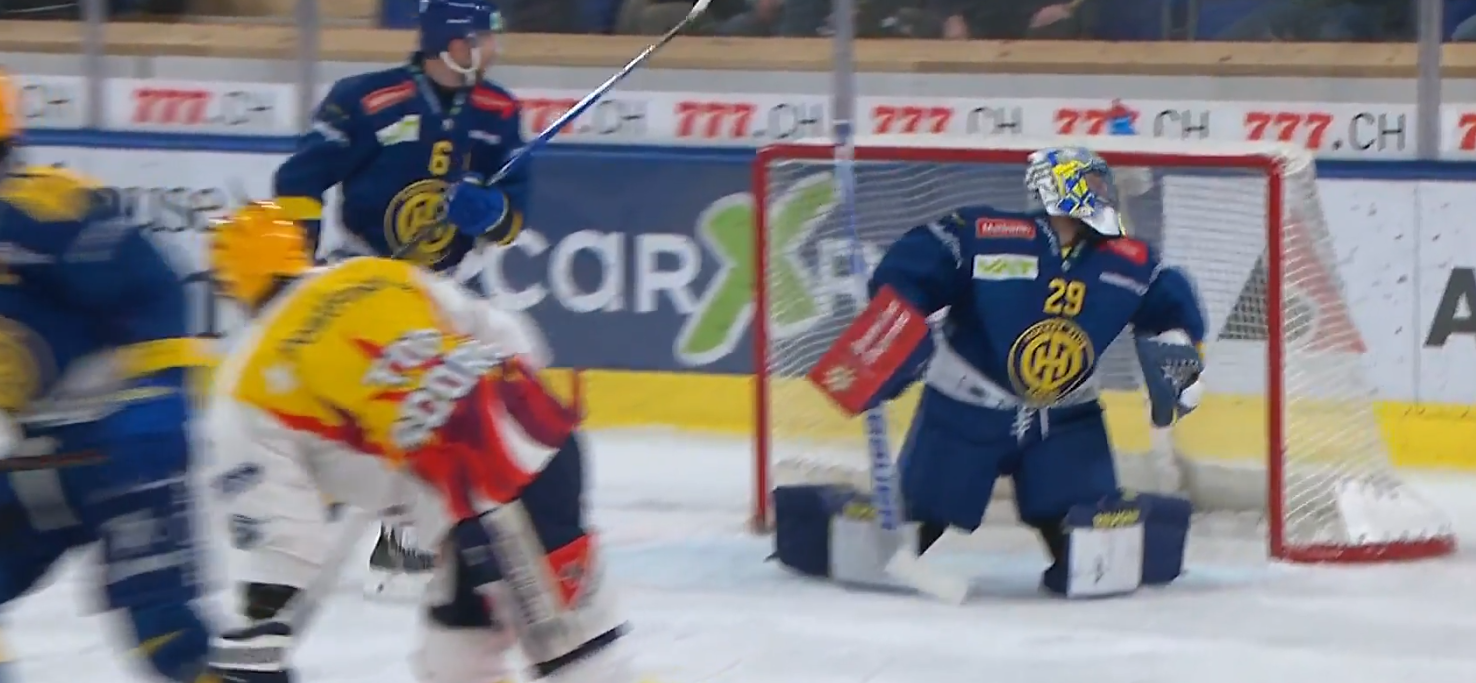 Aeschlimann muss bereits wieder eingreifen. Kostner lässt mit einer Täuschung den letzten Verteidiger stehen, sieht dann aber seine Vorlage durch den HCD-Schlussmann geklärt.