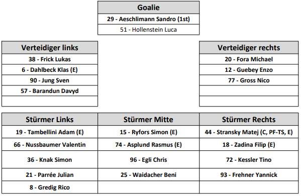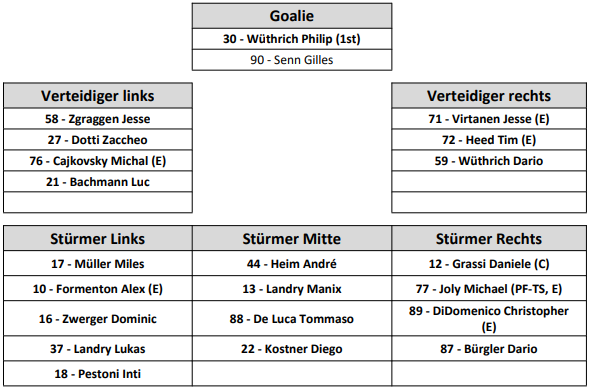 Josh Holden setzt heute beinahe auf die selben Personalien wie noch beim Sieg gegen Zug. Einzig auf der Goalieposition kommt es zu einer kleinen Rochade. Aeschlimann hütet heute den Kasten, Hollenstein steht an der Bande für einen Einsatz bereit. Verletzt fehlen weiterhin Andersson und Lemieux, Corvi ist zudem krankheitsbedingt abwesend.