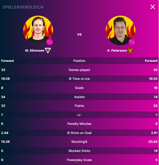 Bei den Freiburgern trägt Marcus Sörensen den gelben Helm er fehlt jedoch heute aufgrund einer Verletzung aus dem Spiel gegen Lugano. Er liegt aktuell mit 8 Toren und 24 Assists bei 32 Scorern. Ihm gegenüber steht heute sein schwedischer Landsmann André Petersson. Der Stürmer kommt mit 19 Toren und 14 Assists auf insgesamt 33 Punkte.