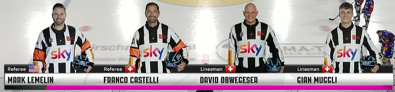 Die Banden krachen, die Emotionen gehen hoch – klar, sind auch heute wieder Schiedsrichter gefragt. Für die nötige Fairness sorgen Lemelin und Castelli. Unterstützt werden sie dabei von Obwegeser und Muggli.