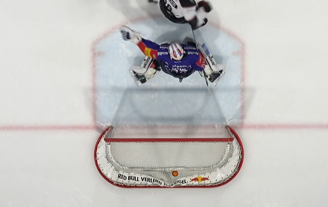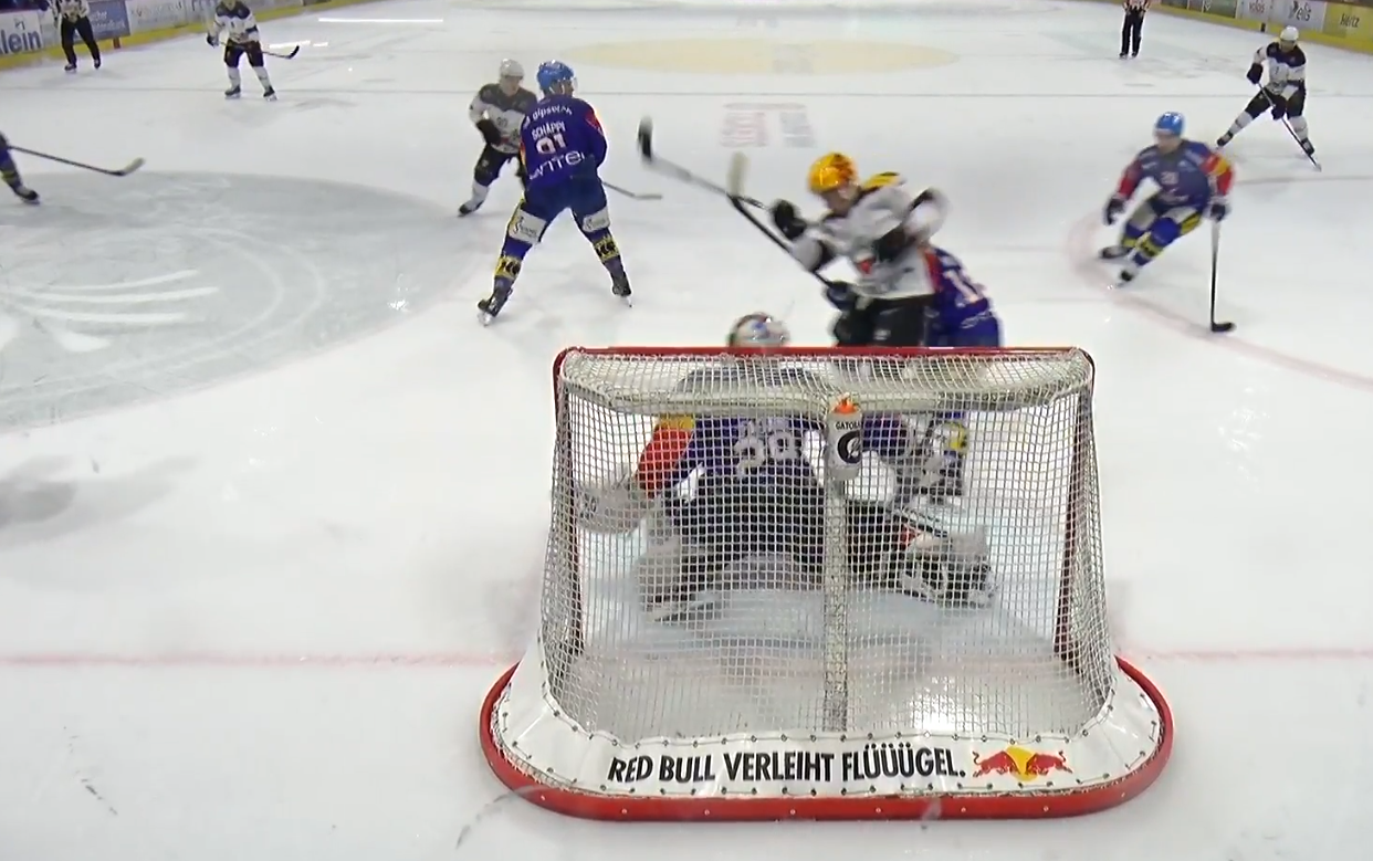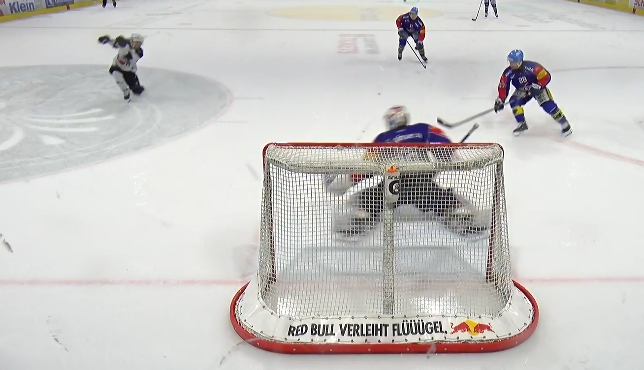 Pasche muss gleich doppelt eingreifen! Ramel zieht von der blauen Linie ab, der Schlussmann der Gäste kann die Scheibe aber mit dem Beinschoner abwehren. Dies auf Kosten eines Abprallers, welchen Meyer ausnutzen will. Doch Pasche verschiebt blitzschnell und macht die entstandene Lücke zu.
