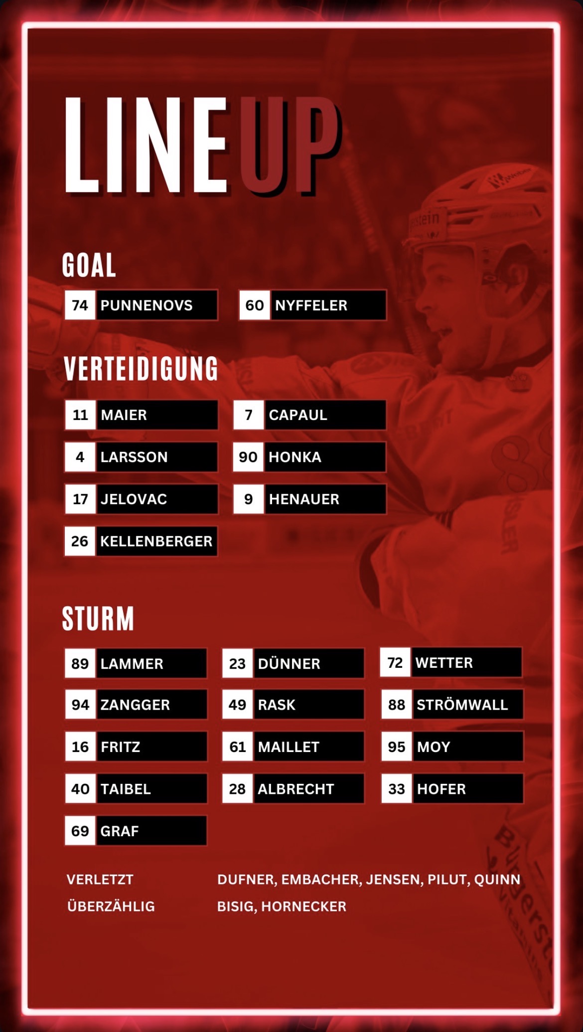 Nach seinem Kopftreffer ist Dominic Lammer nicht zurückgekehrt. Hofer übernimmt seinen Platz in der ersten Linie, Graf rückt in die vierte Linie.