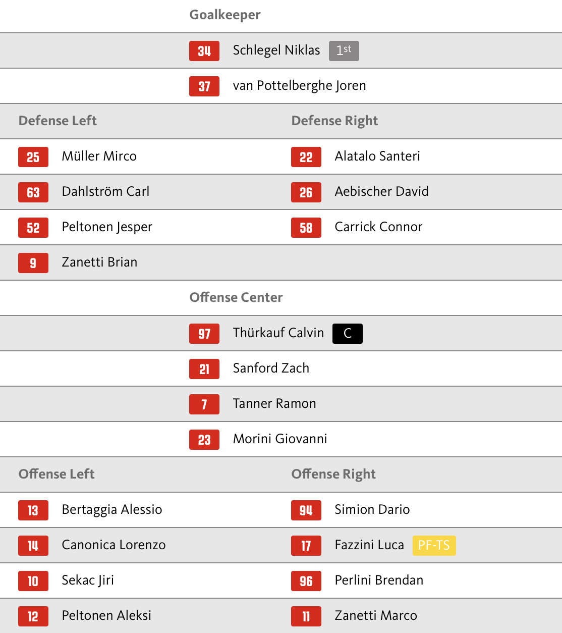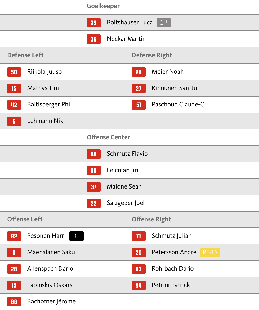 Wie in der letzten Partie hütet auch Luca Boltshauser heute das Tor. Joshua Fahrni ist überzählig. Hannes Björninen und Samuel Erni fehlen verletzt.