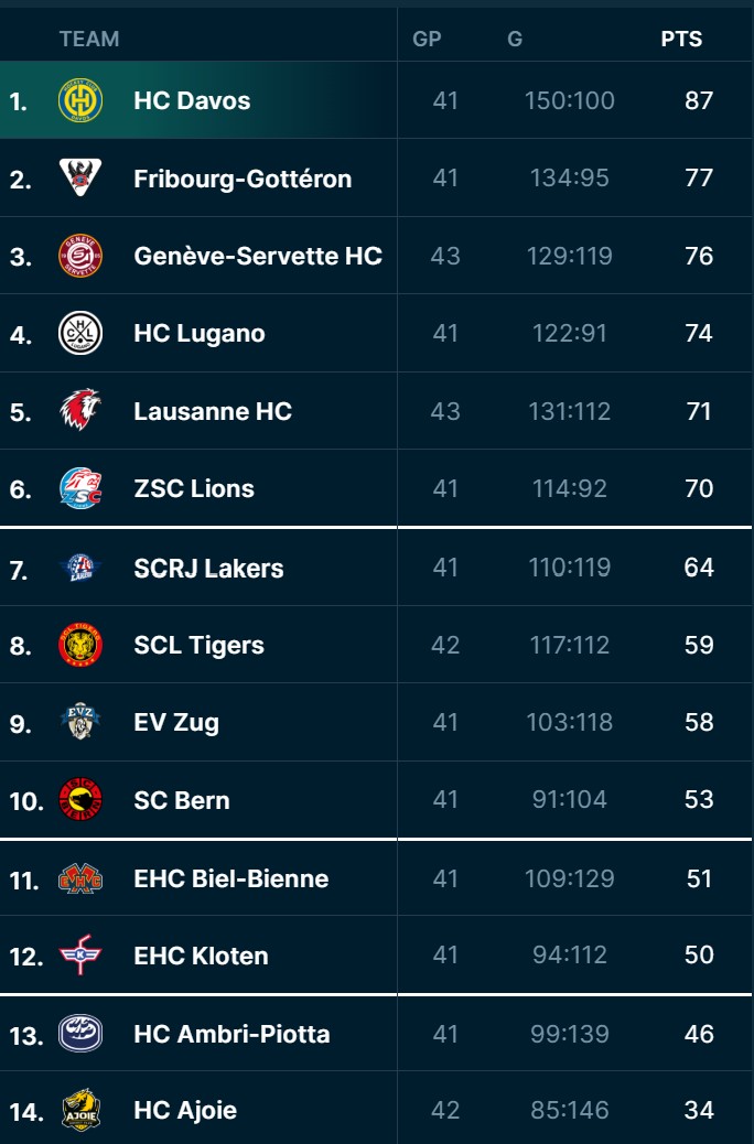 Die Ajoulots sind so weit abgeschlagen, dass sie nur für sich spielen. Wie bereits die gesamte Saison stehen sie auf dem letzten Platz und konnten erst 34 Punkte sammeln. Ambri auf Platz 13 ist ganze zwölf Punkte entfernt. Der Blick nach unten zeigt, wie eng es für die Jurassier aussieht und dass sie bereits früh in der Saison mit den Playouts rechnen müssen.