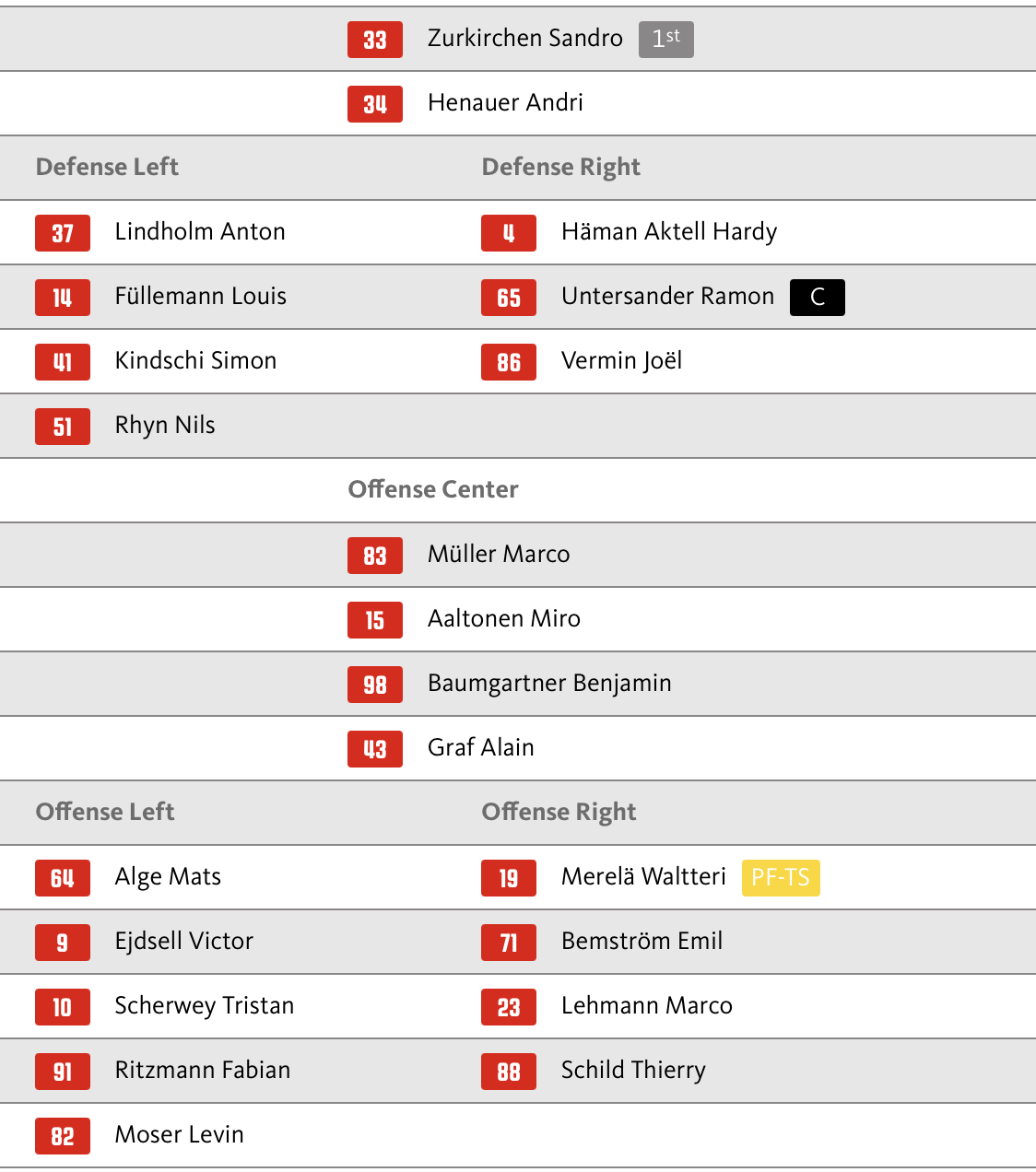 Für seine Trainerpremiere beim SC Bern in der National League hat Heinz Ehlers einige Veränderungen vorgenommen im Vergleich zum Tatzenderby. Sandro Zurkirchen hütet heute das Tor. Dafür ist Adam Reideborn überzählig. Andri Henauer, Hardy Häman Aktell, Victor Ejdsell, Marco Lehmann und Levin Moser sind zurück im Line-up. Einzig die erste Sturmlinie liess Ehlers gleich. Marc Marchon, Simon Moser, Samuel Kreis und Romain Loeffel fehlen verletzt. Aleksandr Iakovenko ist krank.