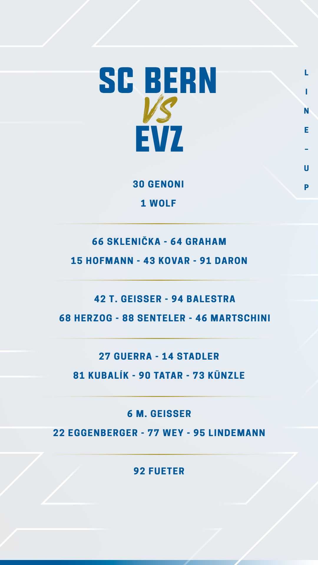 Aufgrund des Krankheitsausfalls von Andreas Wingerli ist Headcoach Michael Liniger zu Änderungen in den Sturmformationen gezwungen – einzig die vierte Linie bleibt gleich. Jan Daron und Sol Fueter könnten heute zu ihrem Debüt in der National League kommen, während Mischa Geisser zurück im Line-up ist. Bei den Zugern fehlen heute achte verletzte Spieler: Dorian Moret, Raphael Diaz, Dominik Schlumpf, Lukas Bengtsson, Elia Riva, Sven Leuenberger, Robin Nico Antenen und Daniel Vozenilek. Im Tor steht heute im Vergleich zu gestern Leonardo Genoni statt Tim Wolf.