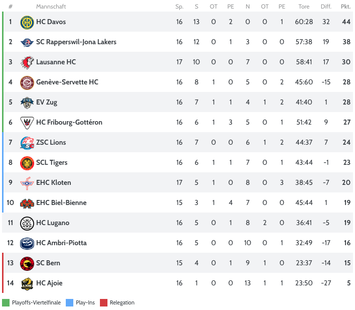 Es ist ein Spitzenspiel am heutigen Abend, das Duell der beiden Verfolger des Spitzenreiters HCD. Auf Rang zwei liegen überraschend die Rapperswil-Jona Lakers, die einen hervorragenden Saisonstart erwischt und nach 16 Spielen bereits 38 Punkte gesammelt haben. Mit einem Sieg könnten sie dem HCD unter Umständen wieder etwas näherkommen. Acht Punkte dahinter folgt auf Rang drei der Lausanne HC, die Waadtländer haben bereits 17 Partien absolviert und dabei 30 Punkte geholt. Ein Sieg heute wäre wichtig, um am Spitzenduo dranzubleiben, bei einer Niederlage droht der Fall bis auf Rang fünf.