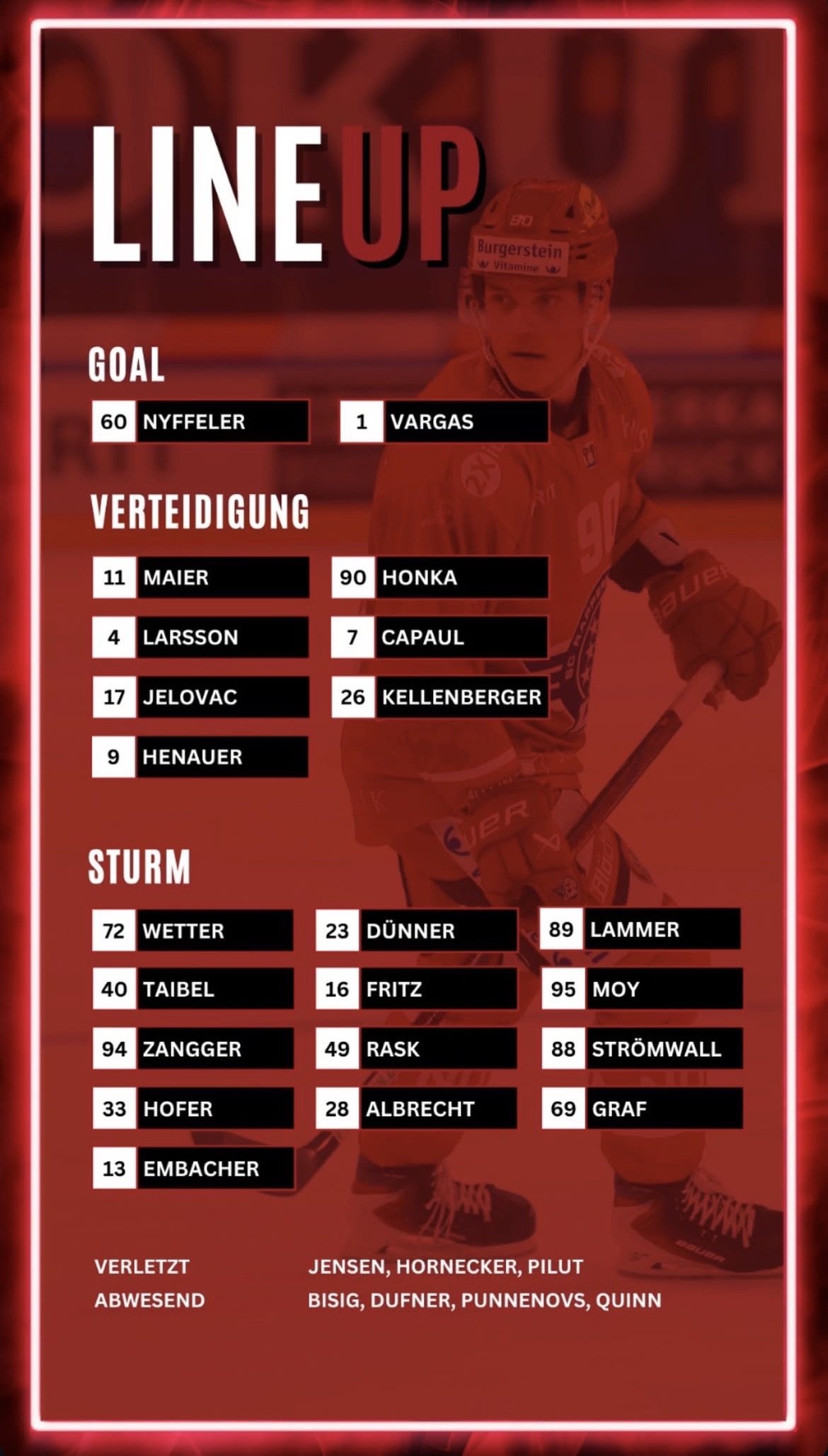 Bei den Lakers steht heute Melvin Nyffeler im Tor, er weist eine Fangquote von 91.67% auf. Verzichten muss Coach Johan Lundskog auf die Verletzten Lawrence Pilut, Jan Hornecker, Nicklas Jensen und Ivars Punnenovs, zudem fällt Mauro Dufner krankheitsbedingt aus.