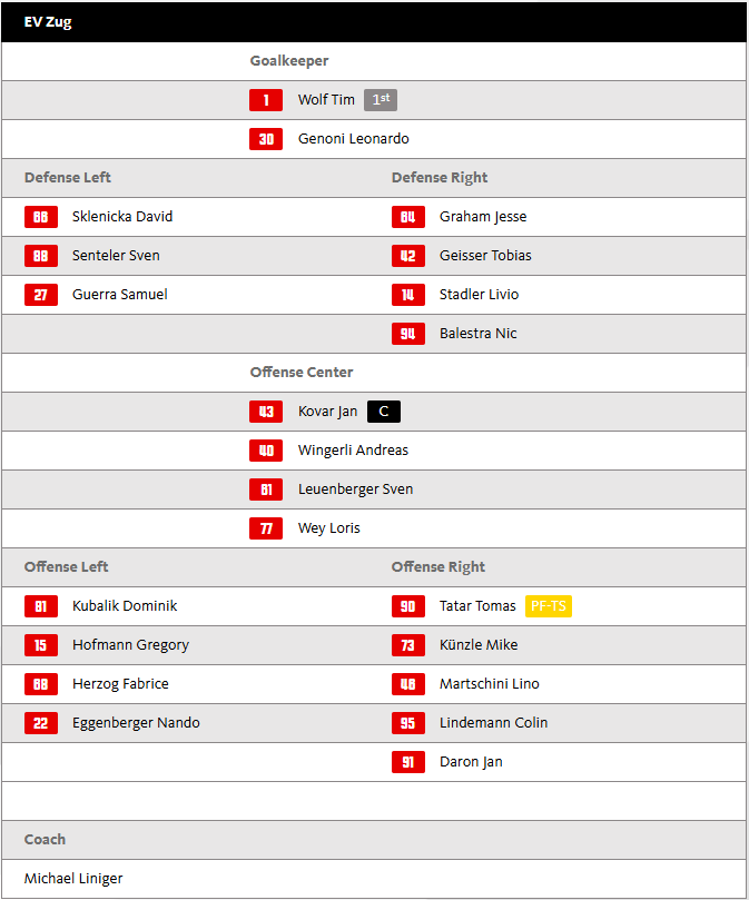 Heute steht Tim Wolf bei den Zugern zwischen den Pfosten. Genoni erhält eine Pause. In der Verteidigung muss Coach Michael Liniger aufgrund der Ausfälle von Diaz, Schlumpf und Bengtsson weiter improvisieren. So wird Sven Senteler wieder als Verteidiger auflaufen. Im Sturm ist immerhin Sven Leuenberger nach sieben verpassten Spielen zurück.