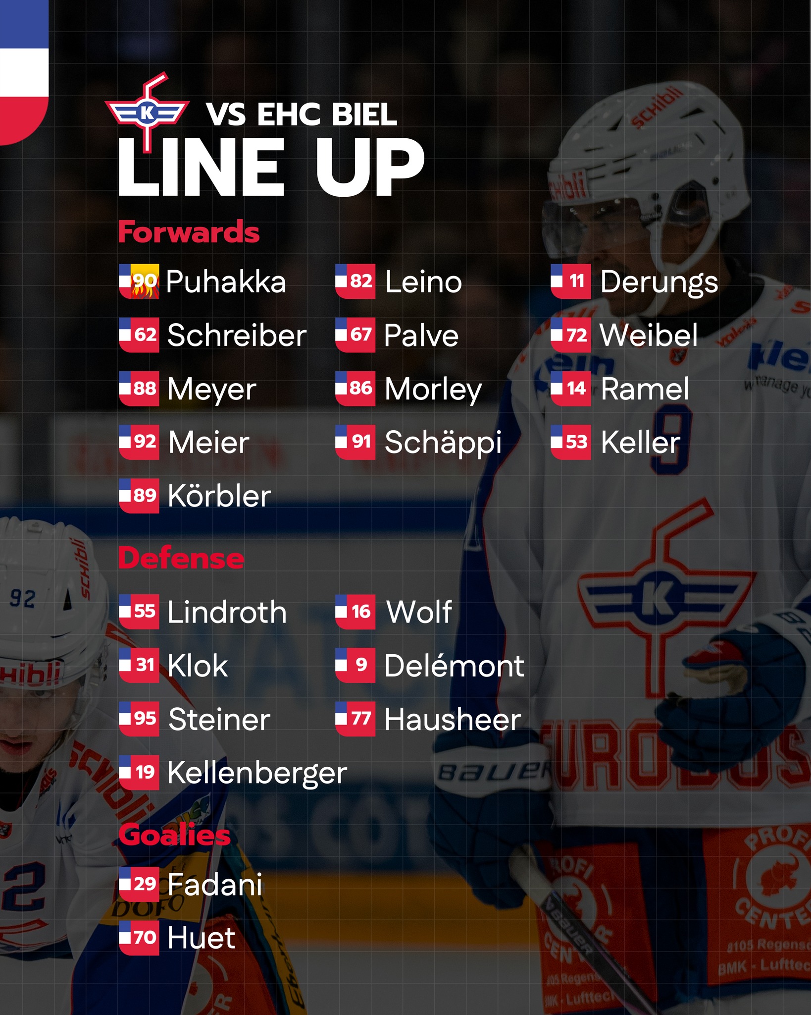 Headcoach Lauri Marjamäki nimmt zur Shootout Niederlage gegen den Genève-Servette HC drei Änderungen im Line-Up vor. Deniss Smirnovs, Leandro Profico und Nolan Diem werden heute durch Rafael Meier, Cyril Keller und Kimi Körbler ersetzt. Keine Rotation gibt es zwischen den Pfosten, denn auch heute startet Davide Fadani anstelle von Ewan Huet.