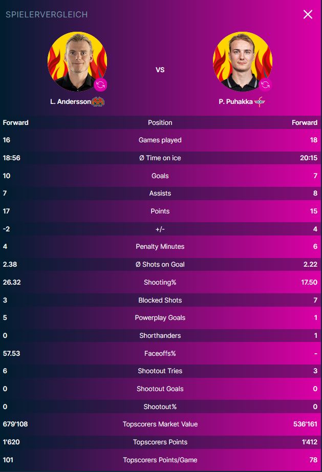 Die jeweiligen Topscorer am heutigen Abend sind auf Seiten des Heimteams Stürmer Lias Andersson (17 Punkte davon 10 Tore und 7 Assists). Bei den Gästen aus Kloten trägt Petteri Puhakka (15 Punkte davon 7 Tore und 8 Assists) den Flammenhelm.
