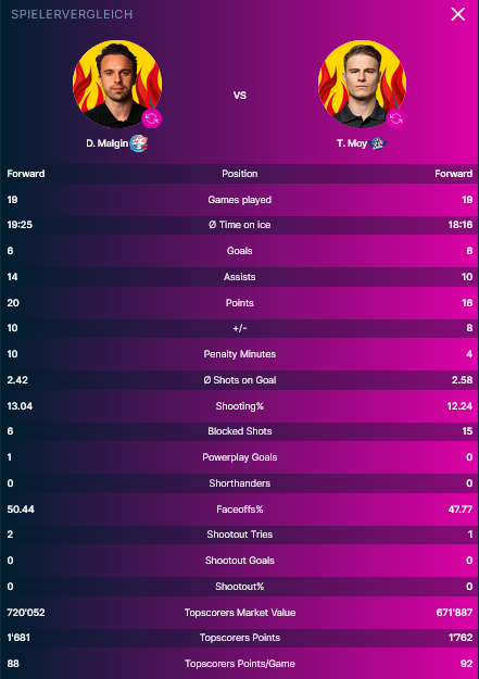 Die jeweiligen Topscorer am heutigen Abend sind auf Seiten des Heimteams Stürmer Denis Malgin (20 Punkte davon 6 Tore und 14 Assists). Bei den Gästen aus Rapperswil trägt Tyler Moy (16 Punkte davon 6 Tore und 10 Assists) den Flammenhelm.